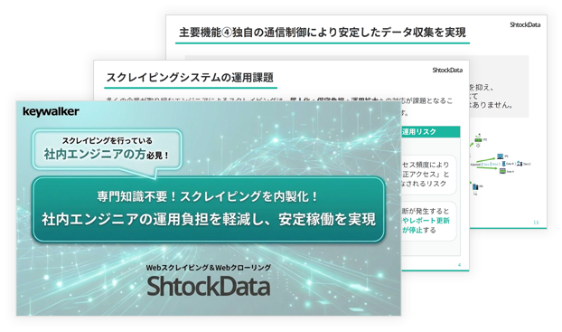 今回は社内エンジニアの方向けに「社内のスクレイピングを内製化する方法」を1冊にまとめました。なぜWebスクレイピング&Webクローリングツール「ShtockData」がスクレイピング内製化が可能なツールなのか、特徴や導入効果、主要機能をご紹介します。